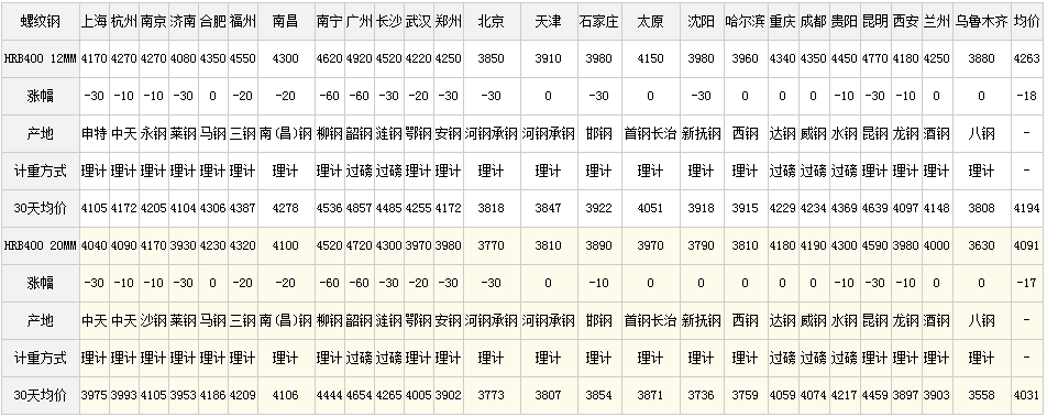 4日,HRB400E 12mm北京市场价格3850元/吨,降30元;石家庄市场3980元/吨,降30元;HRB400E 20mm北京市场3770元/吨,降30元;石家庄3890元/吨,降10元。 阅读量 3,585 Category: 行业资讯2019年12月5日Post navigationPreviousPrevious post:螺纹钢库存或迎拐点 12月钢价料适度回归NextNext post:赞!敬业集团喜获2019年清华经管学院“最佳人才教育奖”!相关文章敬业信德钢筋加工配送的十大优势2025年6月16日敬业信德钢筋加工配送的十大优势2025年5月19日什么是分布筋、受力筋、箍筋?详细总结!2025年4月22日速记 | 钢筋图集快速记忆口诀!2025年4月16日